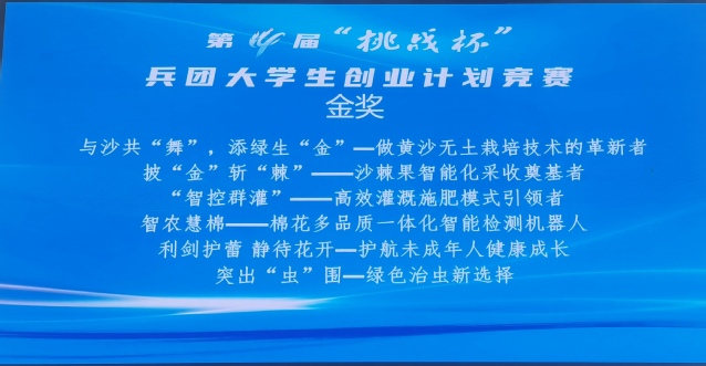 本届大赛设置科技创新和未来产业、乡村振兴和农业农村现代化、生态文明建设和绿色低碳发展、文化创意和区域交流合作、社会治理和公共服务5个组别。大赛自3月启动以来,公司积极组织教师指导员工申报,共申报项目48项,参与员工413人,指导教师39人,经院赛预赛评审选拔,上报28个项目参与校级复赛,经复赛9个项目进入校级决赛,取得校赛5银4铜的成绩,银奖项目“突出虫围——绿色治虫新选择”被推荐参加兵团终审决赛。决赛现场,公司本科生张慧梅、李国菲和马喜喜组成的答辩团队,经过项目初审、复审、封闭评审、项目展演,答辩时分别从项目背景、产品介绍、商业模式、社会价值和未来展望等方面进行陈述和展示,得到了评委的认可,最终取得分组金奖。