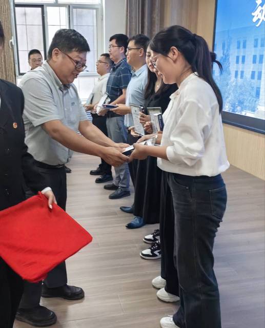 公司党委副书记郭玉堂、副经理盛金良向新进教师赠送了新进教师纪念牌和教具。