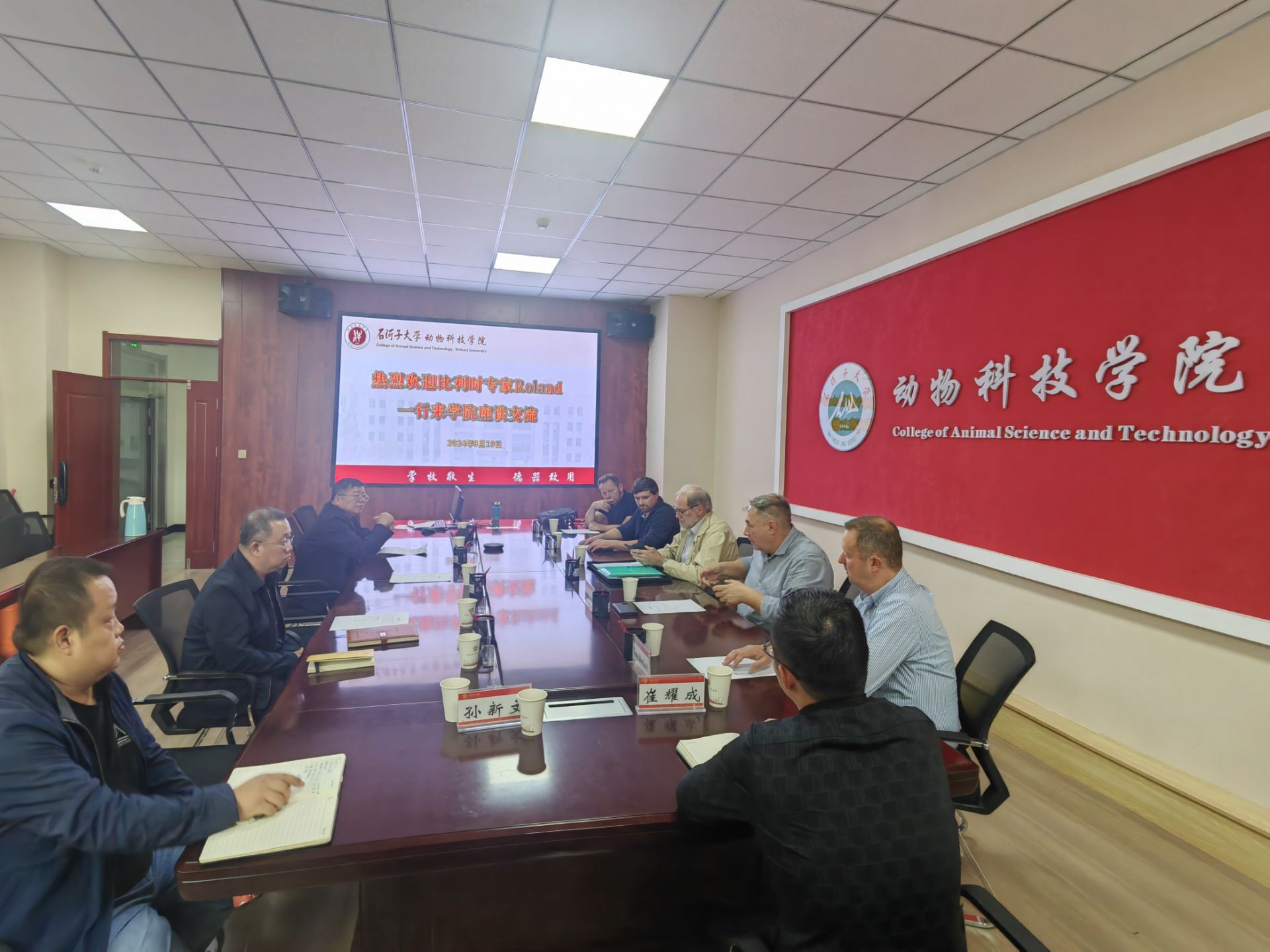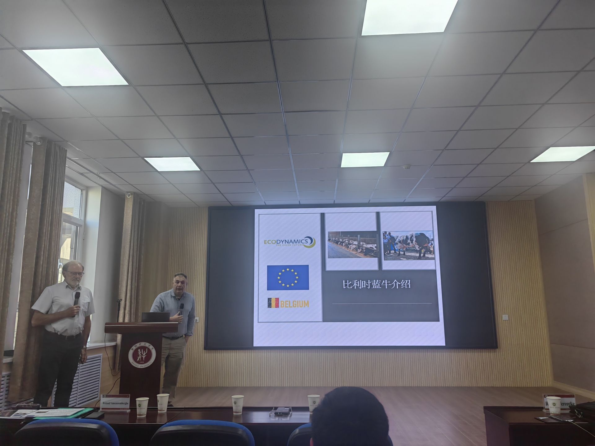 9月19日,比利时蓝白花肉牛专家Roland一行来公司座谈交流。比利时弗拉芒大区土地管理局原局长Roland从全球食品挑战,比利时蓝牛的历史、优点、胚胎、产犊、杂交品种、经济效益、生态效益、健康效益等方面详细介绍比利时蓝牛。公司经理张辉,副经理赵宗胜、盛金良,动物科学系张文举、胡广东、聂存喜、孙新文教授及部分教师、研究生参会交流。在互动环节中,师生们踊跃发言,对比利时蓝牛育种、繁殖、疾病防治等方面提出了疑问并进行了深入探讨;Roland均结合实际案例和自身丰富的经验,给出了专业且具有建设性的解答。