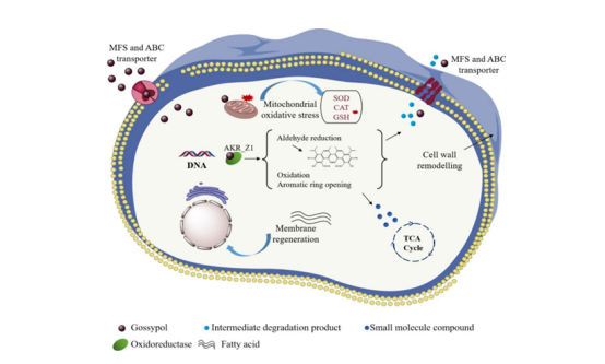 本研究通过转录组学及细胞分析研究手段,深入挖掘热带假丝酵母ZD-3(C. tropicalis ZD-3)降解棉酚的主效基因,寻找棉酚代谢途径中的关键通路,为微生物降解棉酚机制提供新的思路。研究结果表明,C. tropicalis ZD-3通过激活自身抗氧化防御系统,减轻棉酚诱导的氧化应激反应;转录组学分析表明ZD-3通过细胞壁重塑来抵抗棉酚毒性;棉酚胁迫下,ZD-3胞内CTRG_04744基因显著上调,选用毕赤酵母表达并纯化后的AKR_Z1蛋白,在48 h内对棉酚降解率达92%;质谱结果表明棉酚结构上的醛基发生了单还原和双还原的反应,从而有效地去除棉酚中的醛基,达到解毒的目的。本研究结果对棉酚的生物转化机制及开发绿色安全的饲料添加剂提供了重要理论依据。