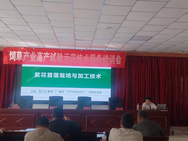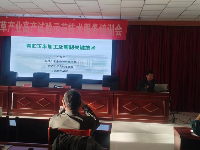 张凡凡教授针对企业发展的困境以问题为导向从牧草生产国家政策支持、畜牧业发展需求缺口为企业后续发展树立良好的前景信心;通过展示国家牧草产业体系石河子综合站近几年的科研成果及转化效益从科学技术上为企业后续发展树立科技信心。针对在苜蓿大田中虫害问题刘慧老师图文并茂详细讲解新疆主要苜蓿病虫草害的识别、为害症状、发生规律、防治指标、防治要点;针对实地调研中虫害发生情况为明年的防治措施提出指导意见。在调研中王旭哲副教授发现38团种植大量玉米,因此结合当地玉米种植情况开展青贮玉米加工及调制关键技术,为企业后续饲草料生产加工提供技术支撑。黄嵘峥老师集中讲解了国内外非常规饲料的发展状况及应用前景,为企业后续充分利用当地饲草料资源提供新的思路。
