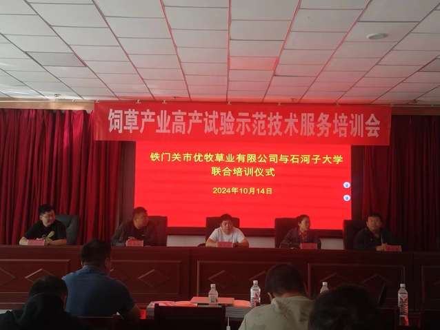 2024年10月13日至15日,国家牧草产业体系石河子综合站马春晖团队成员张凡凡、王旭哲、刘慧、黄嵘峥一行赶赴铁门关市优牧草业有限公司(以下简称优牧)位于38团的万亩优质苜蓿生产基地开展饲草产业高产试验示范技术服务推广培训。
