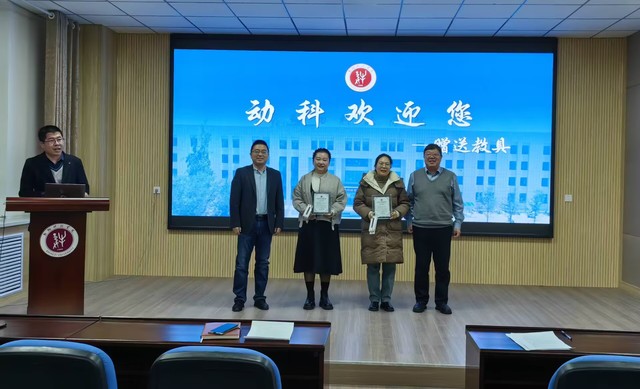会议首先为近期刚到公司工作的张苗苗、刘慧两名老师举办了入职欢迎仪式。孙敬礼介绍了两位教师的个人基本情况,公司党委副书记郭玉堂、副经理盛金良分别向她们颁发了“动科欢迎您”证书和教具。