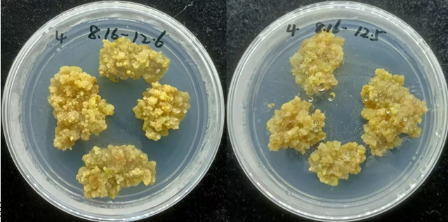 构树(Broussonetia papyrifera)是桑科多年生落叶乔木或灌木,具有环境适应能力强、生长快、耐盐碱的特点,且富含可消化纤维、粗蛋白以及多种活性物质。作为非常规饲料来源,为丰富饲草资源、改善家畜健康提供了多种选择。然而该饲草抗寒能力差、越冬困难,严重影响了其在高纬度地区的推广。本团队连续5年在构树抗寒能力提升方面开展了大量研究工作,发现花青素是提高植物抗逆性的一种有效的方法。然而,构树自身花青素含量低、且花青素合成途径不明确。为此我们通过低温诱导花青素合成,并通过靶向转录组和代谢组分析,揭示了花青素在构树中的合成途径,进一步通过转基因试验,揭示出BpCHS2在烟草中的过表达显著提高了24个花青素相关基因的表达,促进了花青素的积累,并增强抗寒性。目前,我们正在开展该基因的同源转化工作,初步建立构树遗传转化体系,构树分化阶段已完成,经过潮霉素筛选,已获得阳性愈伤组织。为下一步的构树新品种培育奠定了基础。