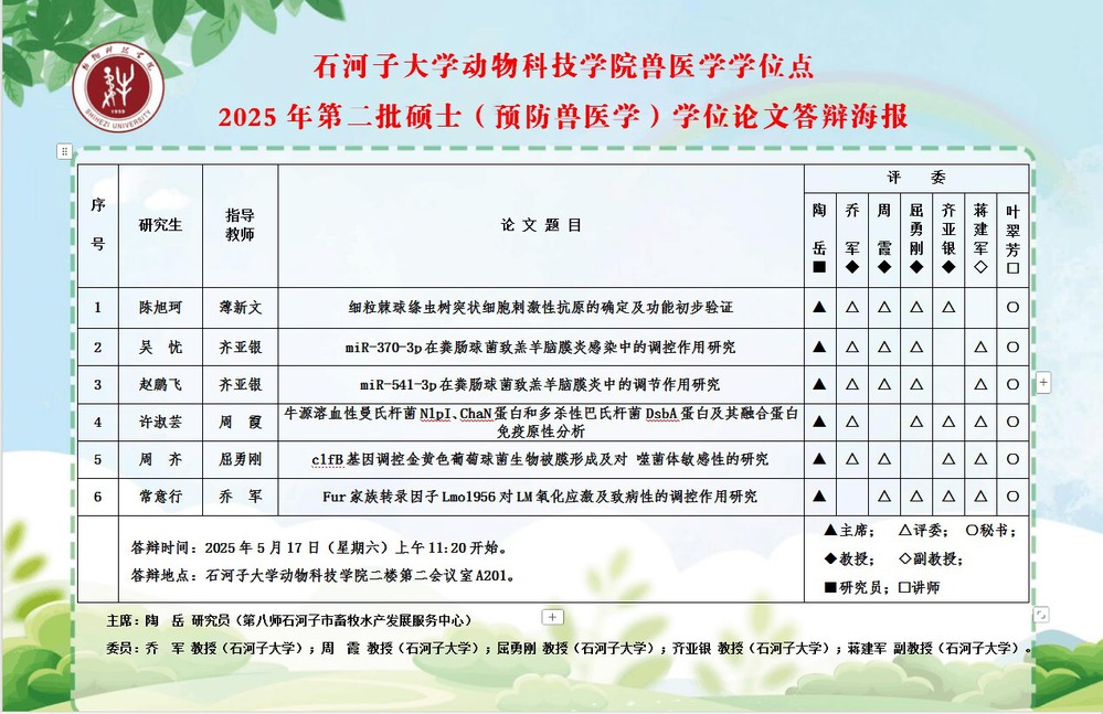 yl23411永利兽医学学位点2025 年第二批硕士(预防兽医学)学位论文答辩海报