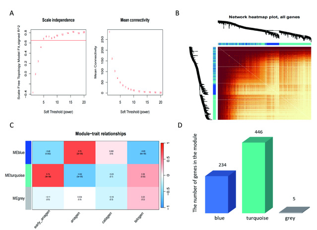 本研究通过分析39个不同毛囊生长阶段的皮肤样本RNA-seq数据,成功鉴定出1591个与毛囊周期密切相关的lncRNA,并发现其中68%的差异表达lncRNA在毛囊从生长期早期向完全生长期(过渡期Ⅰ)转换时呈现与光周期缩短诱导相似的表达模式,提示光信号可能通过调控lncRNA网络驱动毛囊周期转换。同时借助加权基因共表达网络分析(WGCNA),进一步筛选出2个核心基因簇和10个关键枢纽lncRNA。这些分子可能通过顺式或反式调控生物钟基因(如CLOCK家族)、溶质载体超家族(SLC)基因及成纤维细胞生长因子(FGF)基因,影响毛囊进入完全生长期的进程。尤为重要的是,实验证实人工缩短光周期可提前激活这些lncRNA,显著延长绒毛生长期,这一发现为未来通过光调控或基因编辑手段提高绒毛产量提供了理论依据。关键lncRNA的鉴定,不仅为解析哺乳动物季节性生理适应机制提供了新视角,更可能成为绒毛生长精准调控的分子开关。研究团队表示,下一步将针对关键lncRNA开展功能验证,并探索其在绒毛品质改良中的应用潜力。