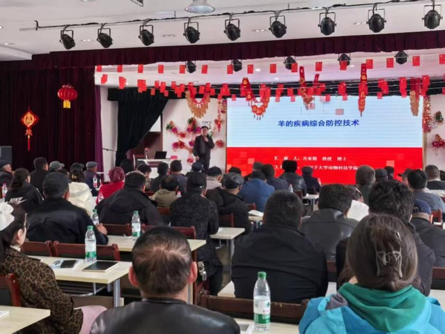 服务团队抵达牧场后,现场走访了数个牛羊的放牧及集中养殖场所,进行了饲养管理、疫病防控、市场行情等方面的调研工作,并给牧民手把手讲解了相关疫病的诊断、防控和治疗知识;然后结合现场调研情况开展了《牛羊疾病综合防控技术》的专题讲座,培训现场座无虚席,120 余名养殖户热情参与。专家们将晦涩的专业知识转化为通俗易懂的语言,通过图文并茂的 PPT,详细讲解牛羊常见疫病的发病机理、临床症状、诊断方法及科学防治策略。