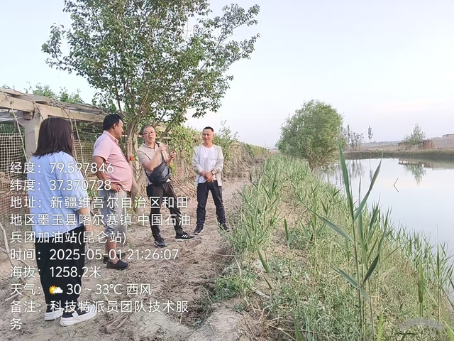 我方科技特派员团队于5月1日到达4连主要水产养殖农户开展服务对接和技术培训。水产养殖户肉孜首先介绍了室外养殖池生产基地的基本概况,赵静老师因地制宜地讲解了该养殖土池主要水质特点和下一步优化方案;刘涵老师针对室外养殖池生产基地基本硬件设施进行了合理化建议,为农户下一步投放养殖鱼苗和蟹苗提供质量保障。