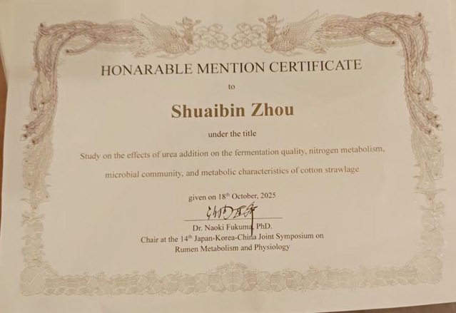 在学术汇报环节,研究生周帅宾作了题为《Effects of urea on the fermentation quality, nitrogen metabolism, microbial community, and metabolic characteristics of cotton strawlage》的报告。报告系统展示了团队在粗饲料资源化利用方面的研究成果,以及新疆地区粗饲料开发利用的现状和前景,引发了与会专家的热烈讨论与广泛认可,获口头报告二等奖。