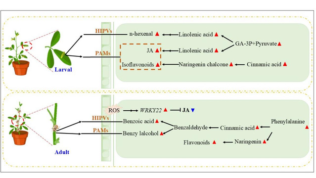 1. 分而治之的防御路径:苜蓿叶象甲幼虫的取食下会强烈激活紫花苜蓿体内的茉莉酸信号通路,上调相关关键基因,促进直接防御化合物的合成。而苜蓿叶象甲成虫的取食则更偏向于激活苯丙烷类代谢途径,导致苜蓿释放出独特的挥发性化合物,特别是苯乙醇的含量比幼虫诱导时高出8.9倍。这些挥发性物质可能在驱避害虫或吸引天敌中发挥作用。