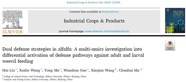 近日,yl23411永利马春晖教授团队首次系统揭示了紫花苜蓿应对苜蓿叶象甲幼虫和成虫危害的“双重防御”分子机制,研究成果以“Dual defense strategies in alfalfa: A multi-omics investigation into differential activation of defense pathways against adult and larval weevil feeding”为题发表在农林领域知名期刊《Industrial Crops and Products》(IF 6.2,中科院1区TOP期刊)。该研究创新性地发现,紫花苜蓿能够“精准识别”苜蓿叶象甲成虫和幼虫的不同取食方式,并启动截然不同的防御“武器库”:苜蓿叶象甲幼虫侵害主要激活植物体内的“直接杀伤”系统,而成虫侵害则侧重启动“化学信息战”,释放特定气味信号。研究成果为培育抗虫紫花苜蓿新品种和开发绿色精准防控技术提供了全新的理论依据。